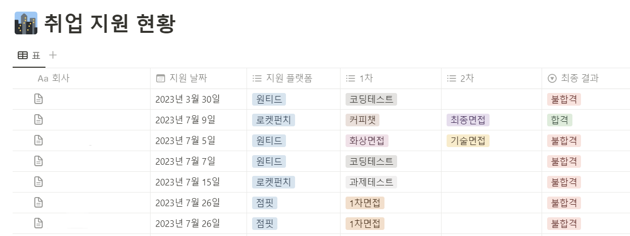 취준 기간 동안 약 100개의 회사에 이력서를 넣었는데 그중에서 7개의 회사에서 이력서를 통과했다. 여기서 실제 면접을 본 회사는 2곳이었고 그중에 하나의 회사에 최종 합격했다. 로켓펀치의 이력서를 보고 회사에서 먼저 연락을 주셔서 커피챗-최종 면접의 과정을 거쳐서 합격 연락을 받았다. 부트캠프 수료 후 5개월 만에 개발자로 취업에 성공한 것이었다.