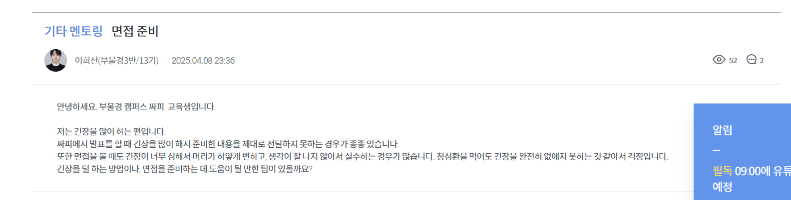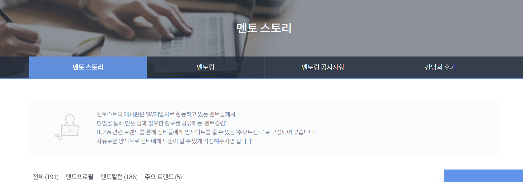 멘토 스토리, 멘토링, 멘토링 공지사항, 간담회 후기 등 현업 SW 개발자로 활동하시는 멘토들의 소식과 학습 방법과 고민 등을 게시판에 올리면 상담을 받아볼 수 있습니다. 저도 면접 떄문에 게시글을 올린 적이 있었는데 2개의 장문의 댓글을 멘토님한테 받아보며 많은 도움이 되었습니다 ㅠㅠ