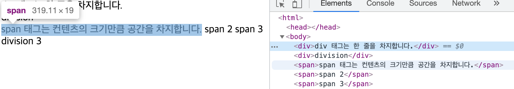 div VS spandiv : 한 줄을 꽉 차지한다.span : 컨텐츠의 크기만큼의 공간을 차지한다.(비교 결과는 아래에!)
