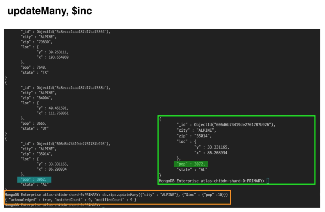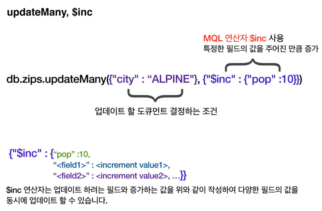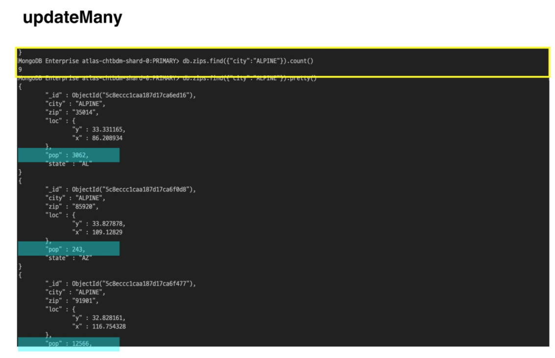 updateMany 사용{“city”: “ALPINE”} : 해당 조건의 지역 인구수 데이터 업데이트 {"$inc" : {"pop" :10}}와 같은 쿼리문을 작성.