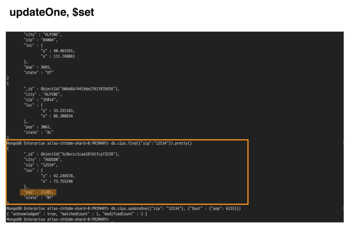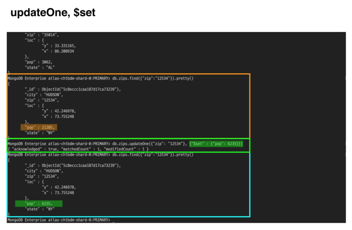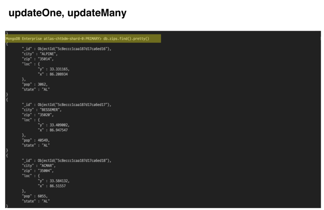 updateOne, updateManyupdateOne : 도큐먼트 중 작업에 맞는 첫번째 도큐먼트 하나만 업데이트updateMany : 쿼리문과 일치하는 모든 도큐먼트를 업데이트 미국의 우편번호 관련 데이터를 가지고 있는 zips라는 컬렉션에서 데이터를 가지고 왔습니다. 그리고 살펴보니 이 데이터에는 단순히 우편번호만 기재 되어 있는 것이 아니라, 우편 번호가 속한 도시이름, 주 이름 등이 기재되어 있고, 그 중에서도 pop 필드에 해당 지역의 인구수를 기록해두었습니다. 그러나 이 데이터들은 몇 년 전의 데이터라서 기록되어 있는 인구수와 현재의 인구수는 일치하지 않을 수도 있습니다.