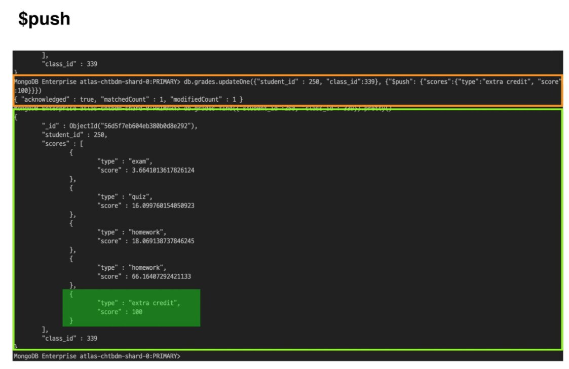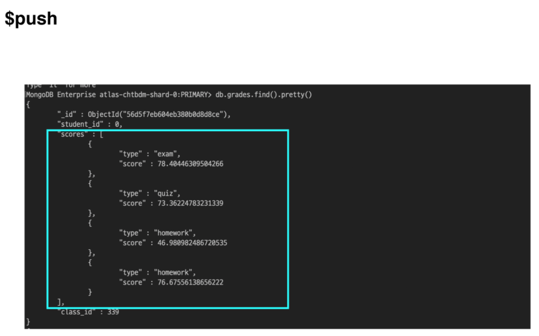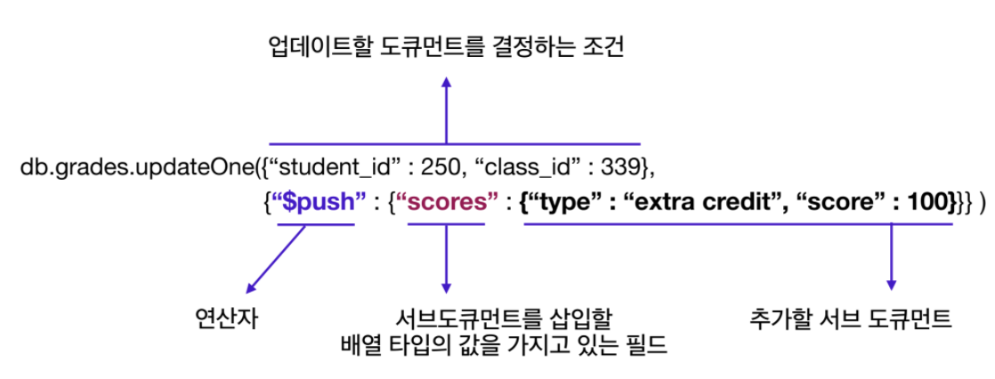 {“type” : “extra credit”, “score” : 100}형태의 서브 도큐먼트를 scores 필드의 값인 배열에 추가해야하므로 배열로 이루어진 필드의 값에 해당 서브 도큐먼트를 추가하기 위한 연산자인$push를 써서 작성합니다.