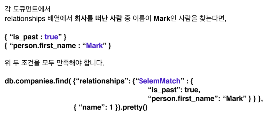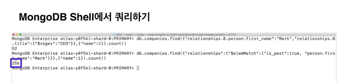 elemMatch 연산자를 사용해 모든 배열 요소를 살펴보고 조건과 일치하는 지 알 수 있다. Shell에서 쿼리를 실행해봅시다. is past 필드가 true이고 person.first_name 필드가 Mark 인 relationships 배열의 요소를 가진 회사 256개를 찾았습니다.