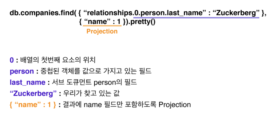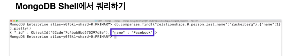 relationships 배열 첫 번째 요소에 마크 주커버그가 있을 것이라고 가정이제 Shell에서 각 도큐먼트에 있는 relationships 배열의 첫 번째 요소에서 last name이 Zuckerberg인 사람을 검색해보겠습니다. 하나의 결과를 얻었으며 결과는 역시 Facebook입니다.