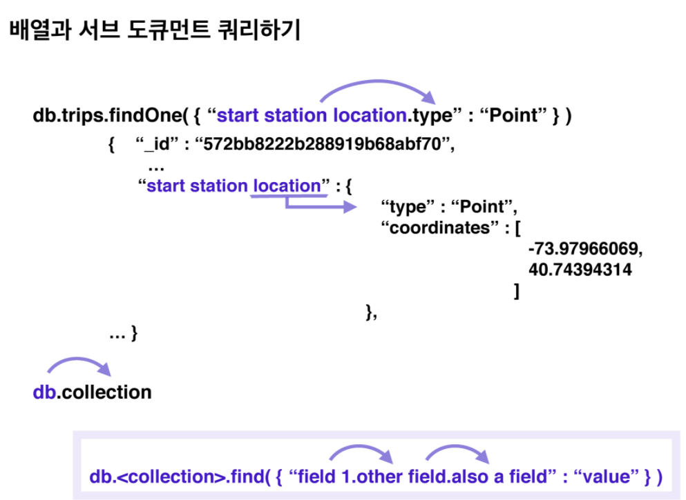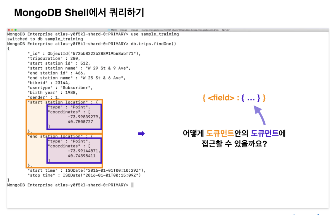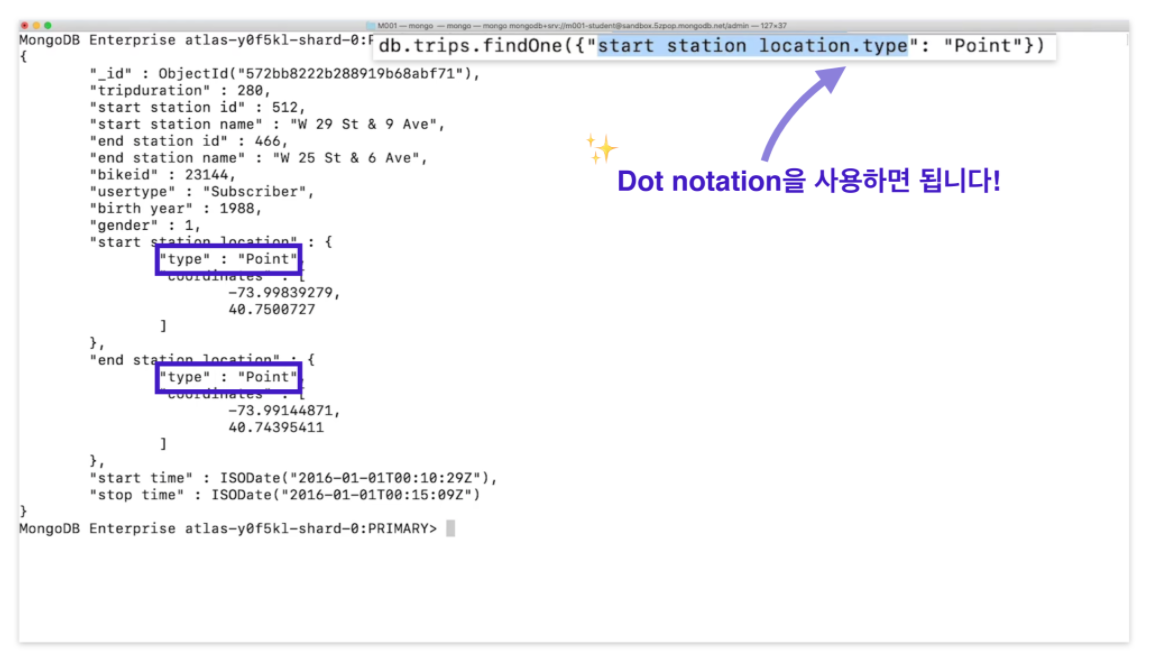 start station location필드의 type 필드 값으로 point를 가지고 있다. start station location 도큐먼트 최상위 필드에는 서브 도큐먼트인 객체가 있다. type과 coordinates 필드가 있다. 서브 도큐먼트의 필드 이름은 최상위 필드 뒤 점으로 구분되며 전체 내용이 따옴표로 묶여 있습니다. 이 표기법은 도큐먼트에서 필요한 만큼 깊이 들어가는 데 사용할 수 있습니다.