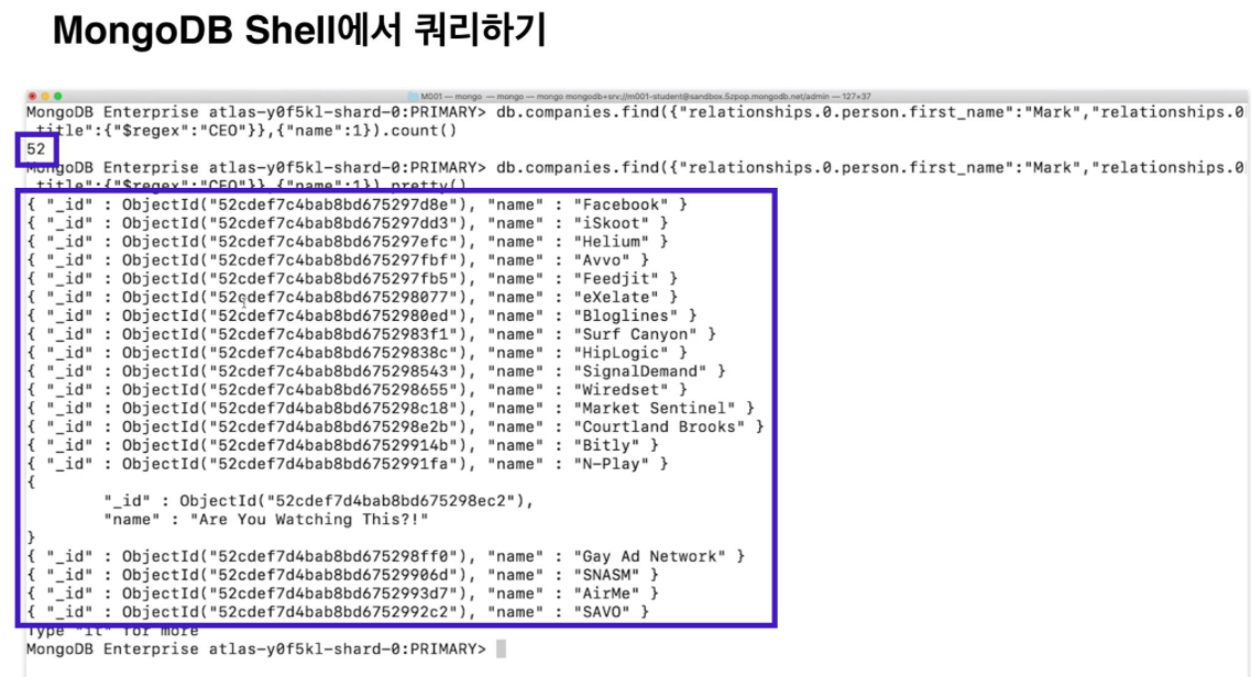 $regex를 사용하여 일치시키려는 문자열을 지정Shell에서 쿼리를 실행해봅시다. 배열 필드의 첫번째 요소의 직함이 CEO이며 이름이 Mark인 52명을 찾았습니다.