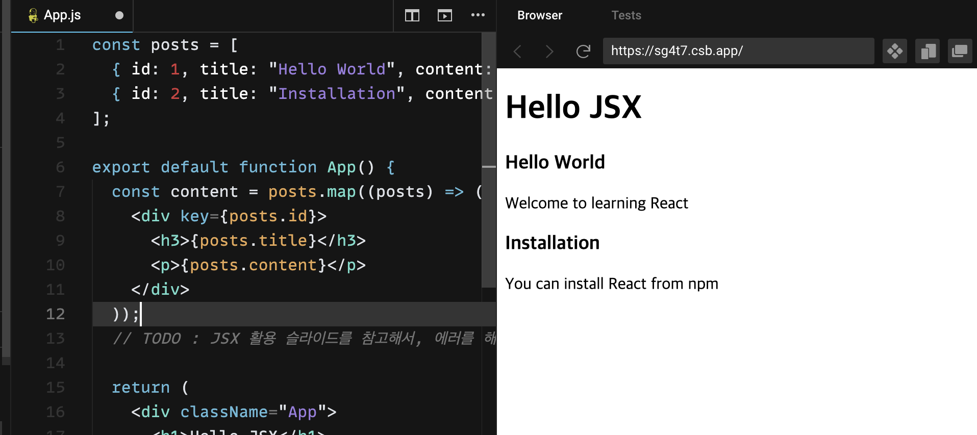 배열의 각 요소(post)를 특정 논리(postToElement 함수)에 의해 다른 요소로 지정(map) 합니다.