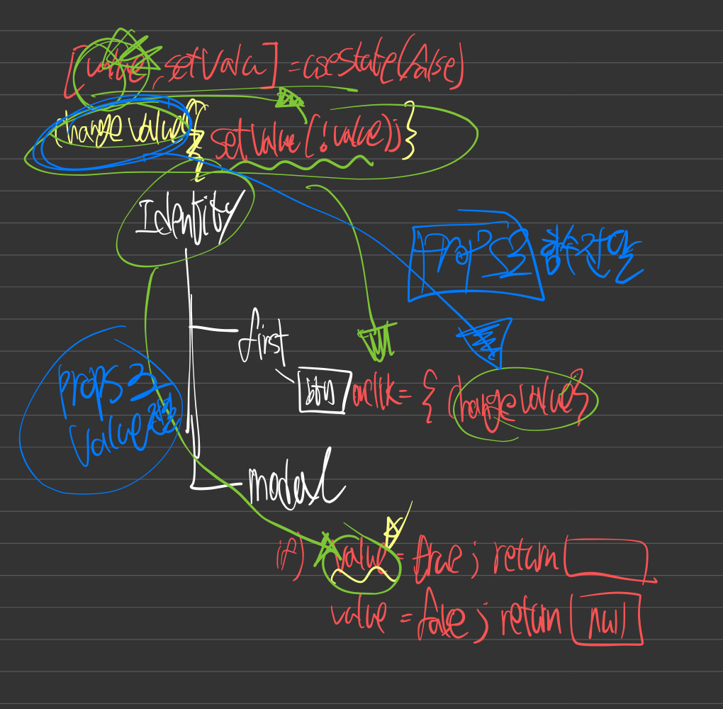 first 에서 onclick을 했을 때 identity에서는 state가 변하는 것을 인지할 수 있다. 그러나 state를 props로 modal에 전달하여 조건문을 사용해도 구현이 되지 않는다.