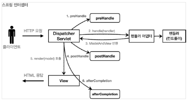 - 스프링 인터셉터는 디스패처 서블릿과 컨트롤러 사이에서 컨트롤러 호출 직전에 호출된다.