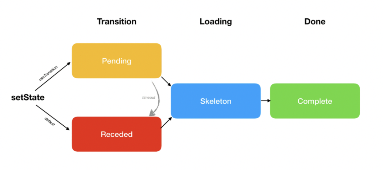 Pending 상태에서도 Receded 상태로 넘어갈 수 있는데 Pending 상태의 시간이 useTransition 옵션으로 지정된 timeoutMs을 넘으면 강제로 Receded 상태로 넘어간다.