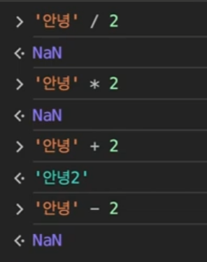 alert("숫자가 아님"/2);//NaN 문자열을 숫자로 나누면 오류가 발생.