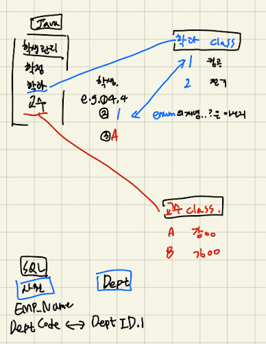 Teacher : 상속…아님 enum도 아님! has a 관계로 생각할 것? 사원은 부서가 될 수 없고 부서에 속해있다. 같은 관계를 생각할 것. 그리고 자바와 디비는 아예 다르다 각자의 존재로 생각하기
