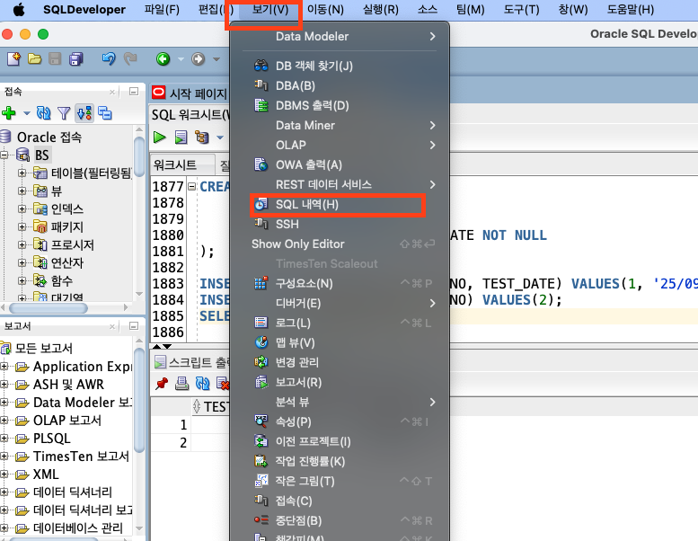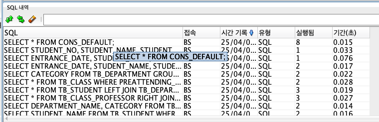 SQL Developer 창에서 보기 -> SQL 내역에 들어간다.