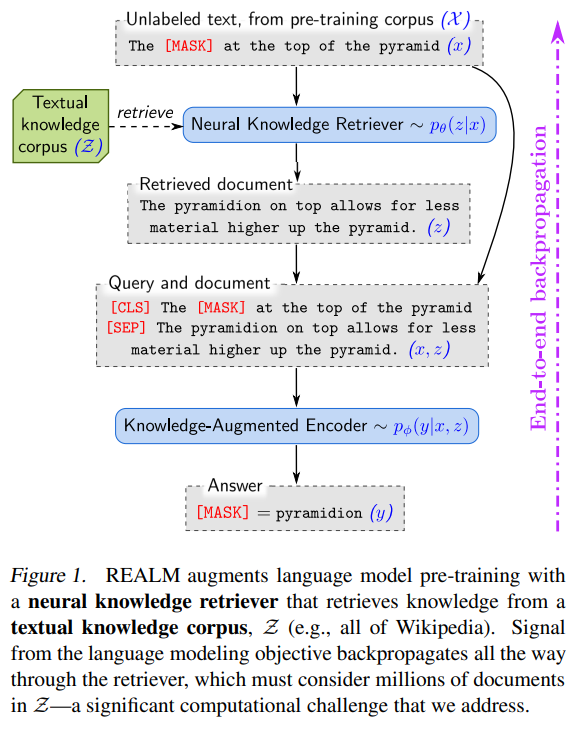 MLM을 학습으로 사용하고, 수백만개의 문서를 고려하여 검색 단계를 통해 역전파 하는 등 비지도 방식으로 knowledge retriever를 사전훈련