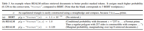 REALM(c)는 BERT model(a)에 비해 단어에 훨씬 높은 확률을 부여한다. REALM은 관련 사실을 가진 일부 문서를 검색하여, 정답에 소외된 확률이 증가한다. 이는 REALM이 unsupervised text로 훈련 되더라도 masked 단얼를 채우기 위해 문서를 검색할 수 있음을 보여준다.