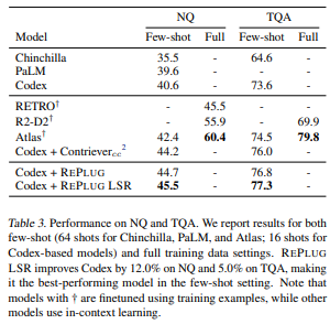 REPLUG LSR은 codex 성능을 NQ에서 12% TQA에서는 5%를 향상 시켰다.