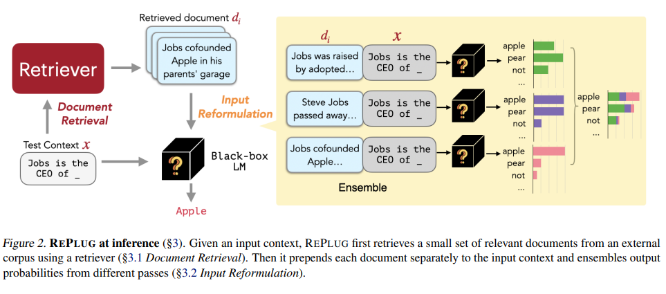 inputcontext가 주어지면 REPLUG는 retriever를 사용하여 외부 corpus에서 관련 document를 검색 -> 검색된 문서는 input context에 의해 선행되고 blackbox LM과 병렬로 encoding 하는 새로운 앙상블 방식을 도입하여 정확성을 위해 쉽게 계산 가능하다.