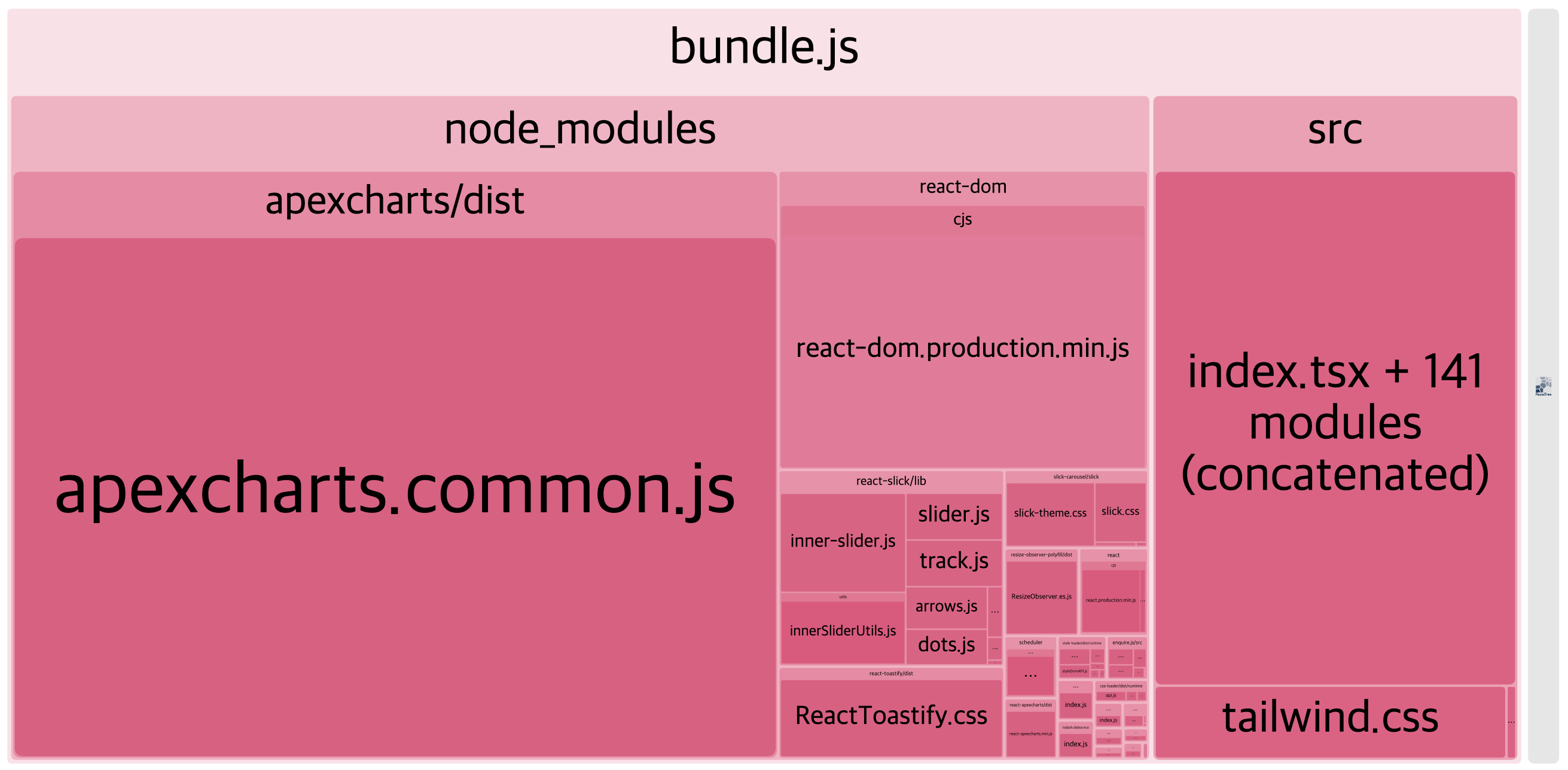 apexcharts, react-dom, react-slick 등)가, 오른쪽(src) 영역에는 애플리케이션 자체 코드(index.tsx, tailwind.css)가 포함되어 있습니다.apexcharts.common.js 등)을 분리하거나 Lazy Loading 대상으로 최적화할 수 있습니다.코드 분할은 단순히 파일을 나누는 기술이 아닙니다.