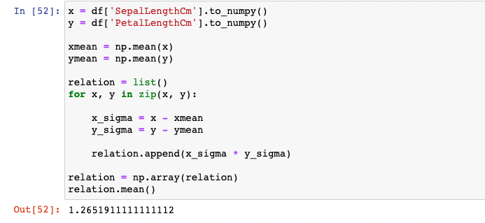 대충 눈대중으로 보기에도 SepalLength와 PetalLength간의 의존도가 있어 보입니다. 따라서 covariance를 구해보겠습니다.
