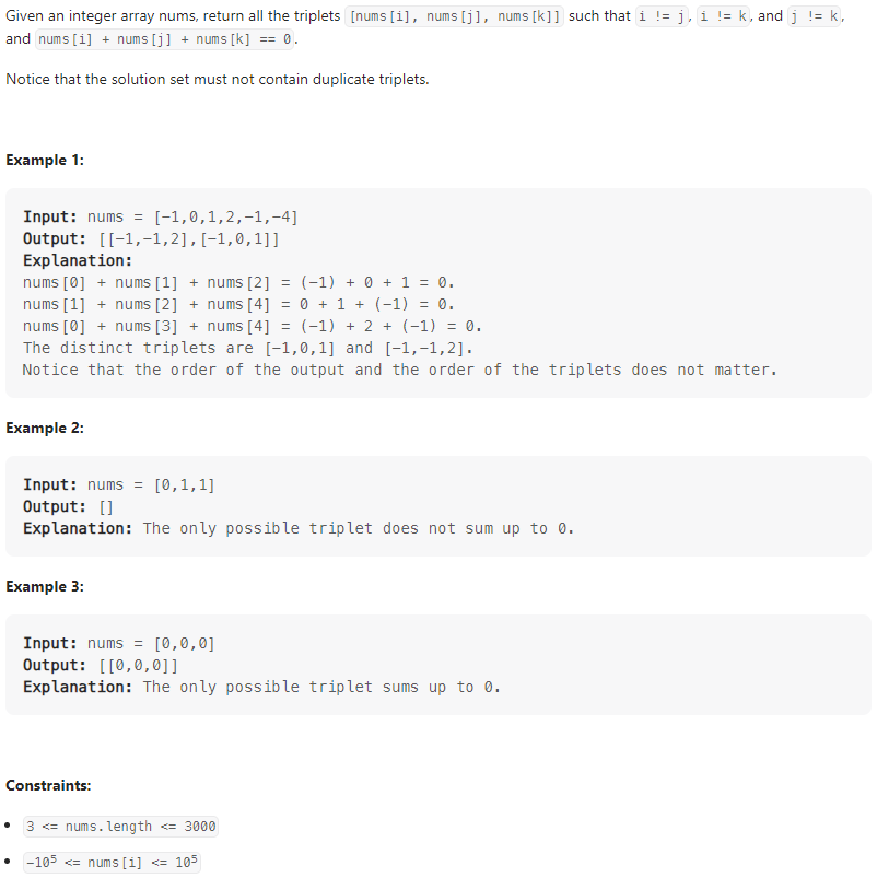 처음엔 세 개의 반복문을 사용하는 브루트포스 방식으로 풀었는데 시간초과가 났다. 시간 복잡도를 에서 정도로 낮춰야 한다. 이 풀이에선 투 포인터를 활용하여 시간 복잡도를 낮춘다. 전체 코드를 처음부터 살펴보면, 먼저 중복된 값을 쉽게 찾을 수 있도록 nums를 정렬한다. 첫 번째 for문에서 중복된 값이 존재하는지 확인한 후 투 포인터인 left, right 값을 설정한다. while문에서 sum을 먼저 계산하고 값이 0보다 큰지 작은지에 따라 left 또는 right를 이동시킨다. 만약 sum이 0이면 results에 현재 i, left, right에 해당하는 nums의 원소들을 패킹하여 추가한다. 추가 후엔 left, right가 중복된 값을 가리키지 않도록 이동시킨 다음에 left, right를 1씩 이동시킨다. nums를 정렬할 때 사용되는 팀소트는 시간 복잡도가 이고 투 포인터를 사용한 while문의 시간 복잡도가 이므로 for문의 시간 복잡도는 가 된다. 따라서 전체 시간 복잡도는 가 된다.