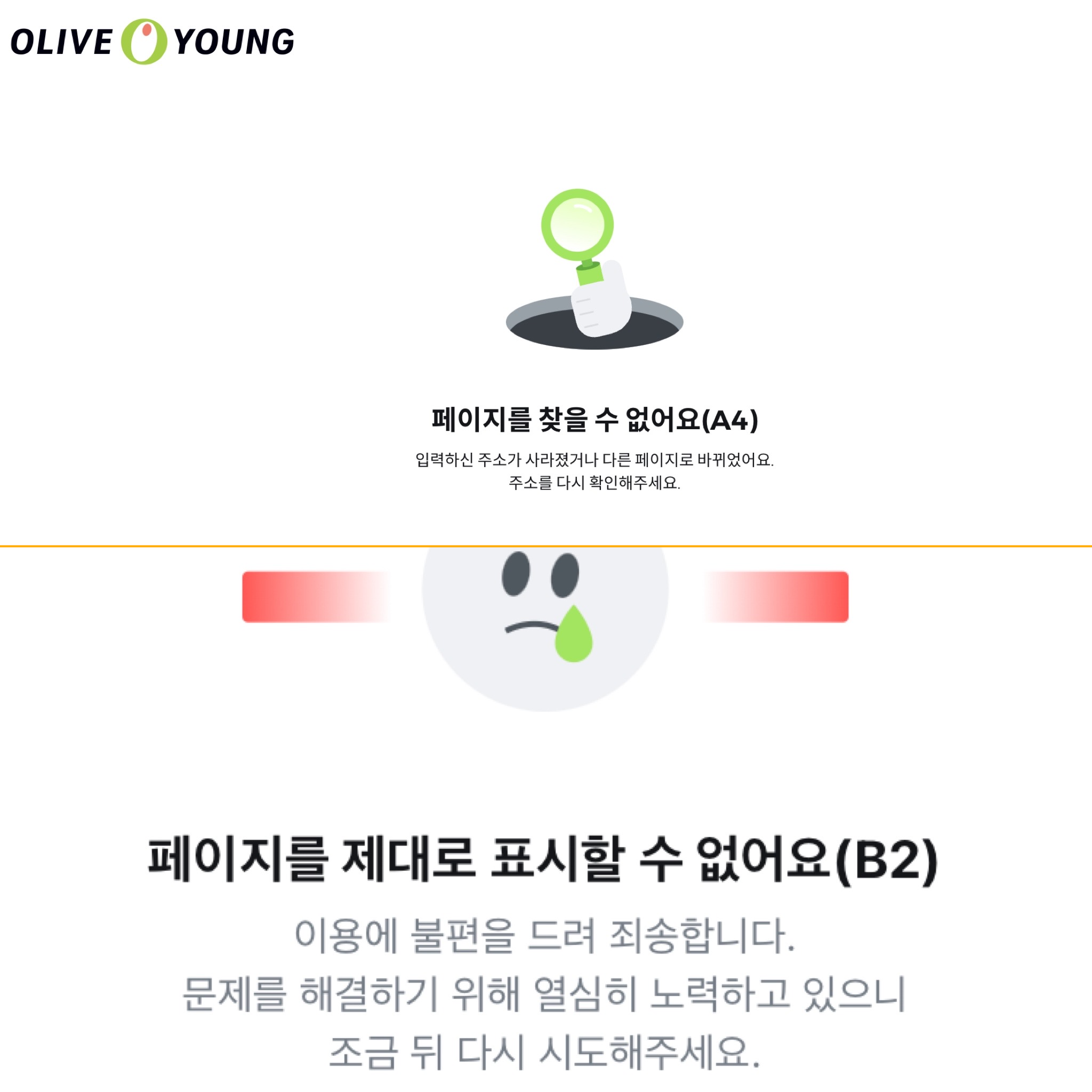 올리브영의 경우, Http status code를 숨기고 내부적으로 사용하는 에러 코드(A4, B2)와 함께 사용자에게 적절한 설명을 첨부한다. 이러한 오류 페이지는 위에서 언급한 문제를 해결한다.