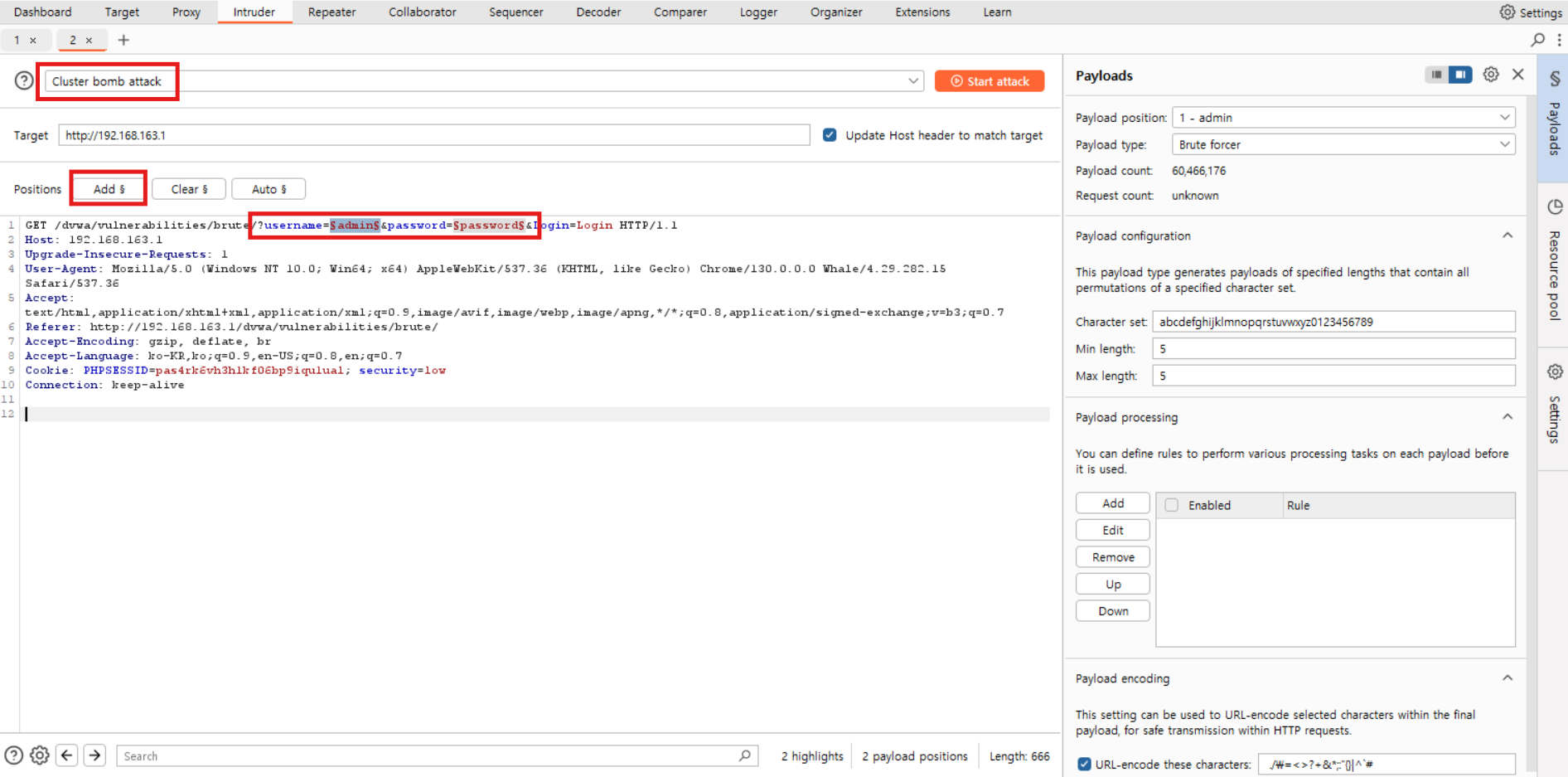 - Cluster Bomb: 여러 Payload Set를 교차 조합하여 모든 가능한 값의 조합을 생성