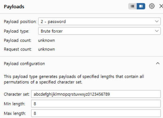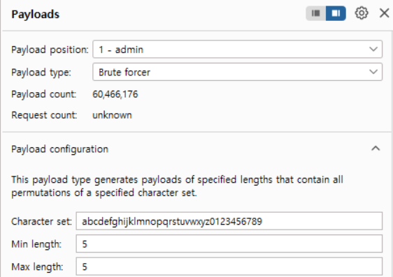 - (현재 이미지 기준) Brute forcer: 특정 길이와 문자 조합으로 무차별 대입(Brute Force) Payload 생성