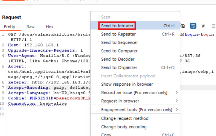 - Request를 우클릭 후, 'Send to Intruder' 클릭