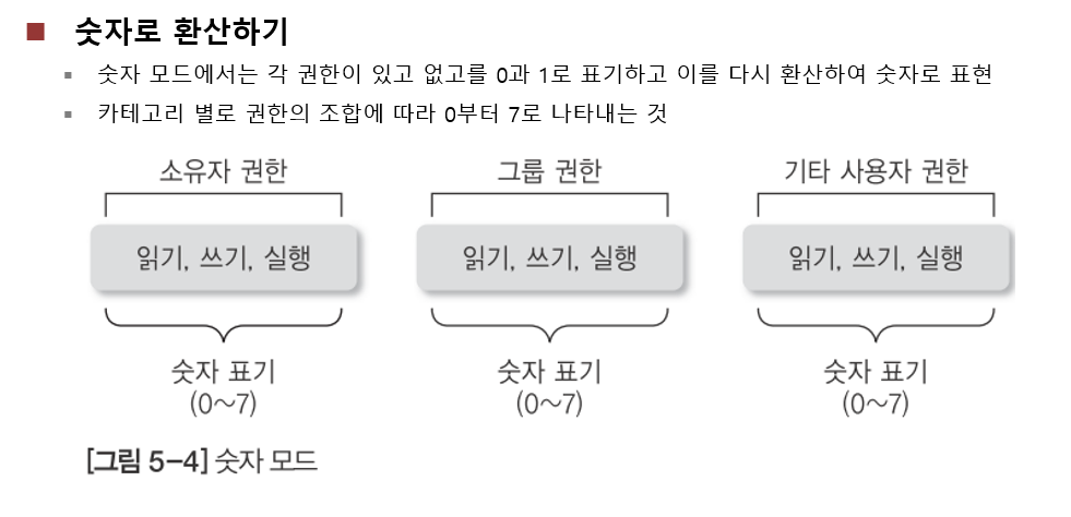 - 각 사용자 카테고리 별로 rwx에서 권한의 유무를 0/1으로 변환하여 2진수 -> 10진수로 변환한다.
