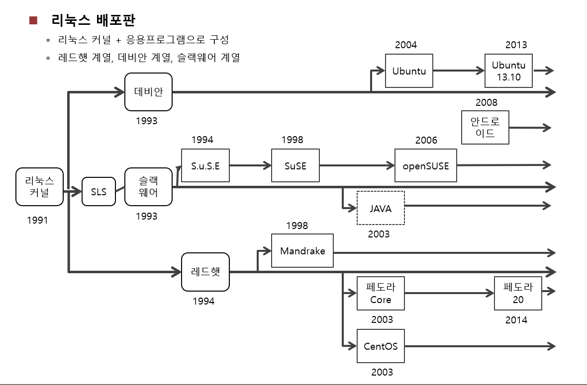 - 리눅스는 리눅스 운영체제 소스코드를 무료로 배포했기 때문에 레드햇, 우분투, centOS 등 다양한 리눅스 배포판들이 생겨났다.