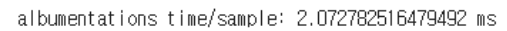 위 예시 코드를 기반으로, 100회를 무작위로 수행했을 때의 수행시간은 위와 같다. albumentations의 수행시간이 약 30배 정도 단축됐다.