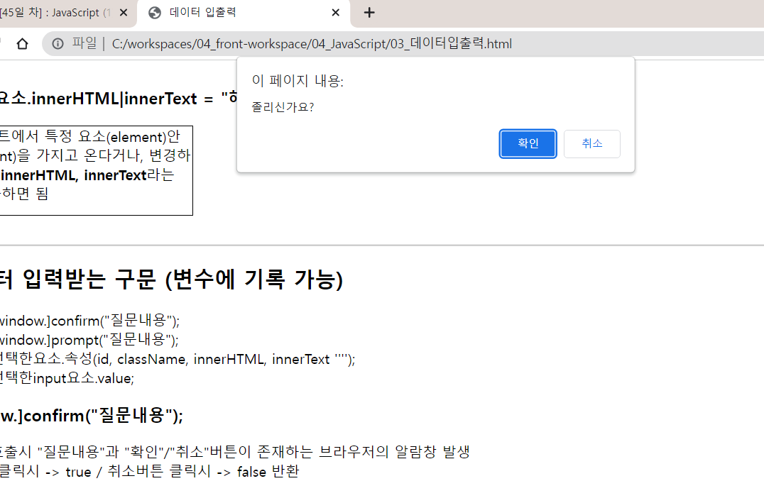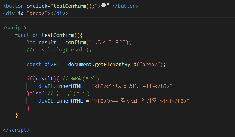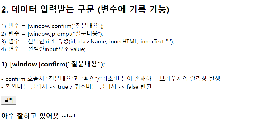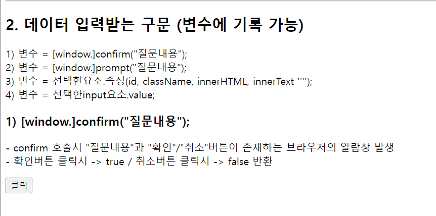 1) 변수 = [window.]confirm("질문내용");