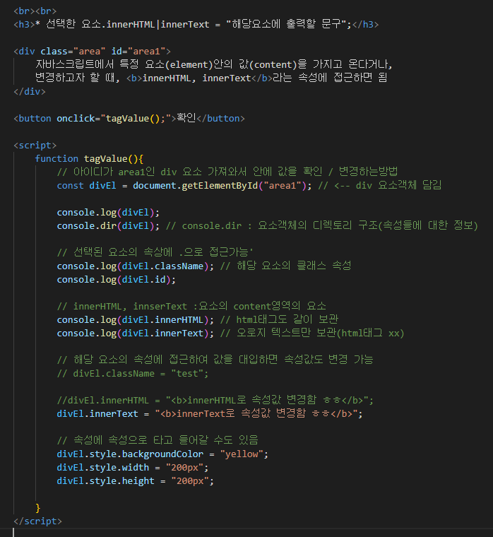 3) 변수 = 선택한요소.속성(id, className, innerHTML, innerText '''');