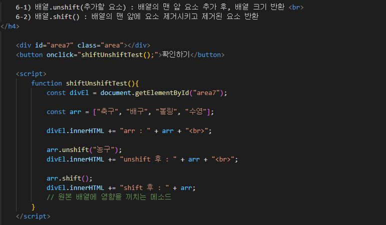 * 배열.unshift(추가할요소) : 배열의 맨 앞에 요소를 추가 후 배열크기 반환
