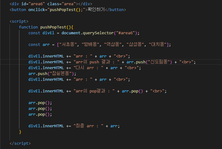 * 배열.pop : 배열의 맨 뒤 요소를 제거시키고 제거된 요소 반환