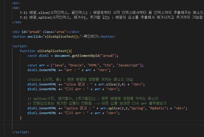 * 배열.splice(시작인덱스,제거수,[추가값]) : 배열의 요소를 추출해서 제거시키고 추가까지 가능