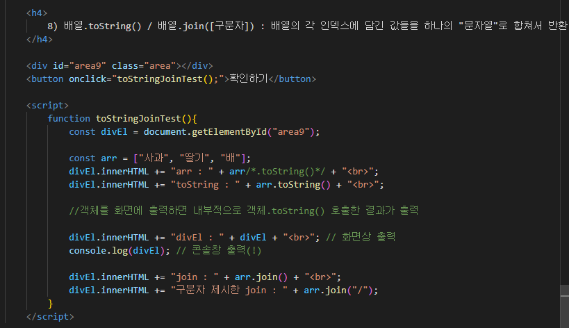* 배열.join([구분자]) : 배열의 각 인덱스에 담긴 값을 하나의 "문자열로 합쳐 반환