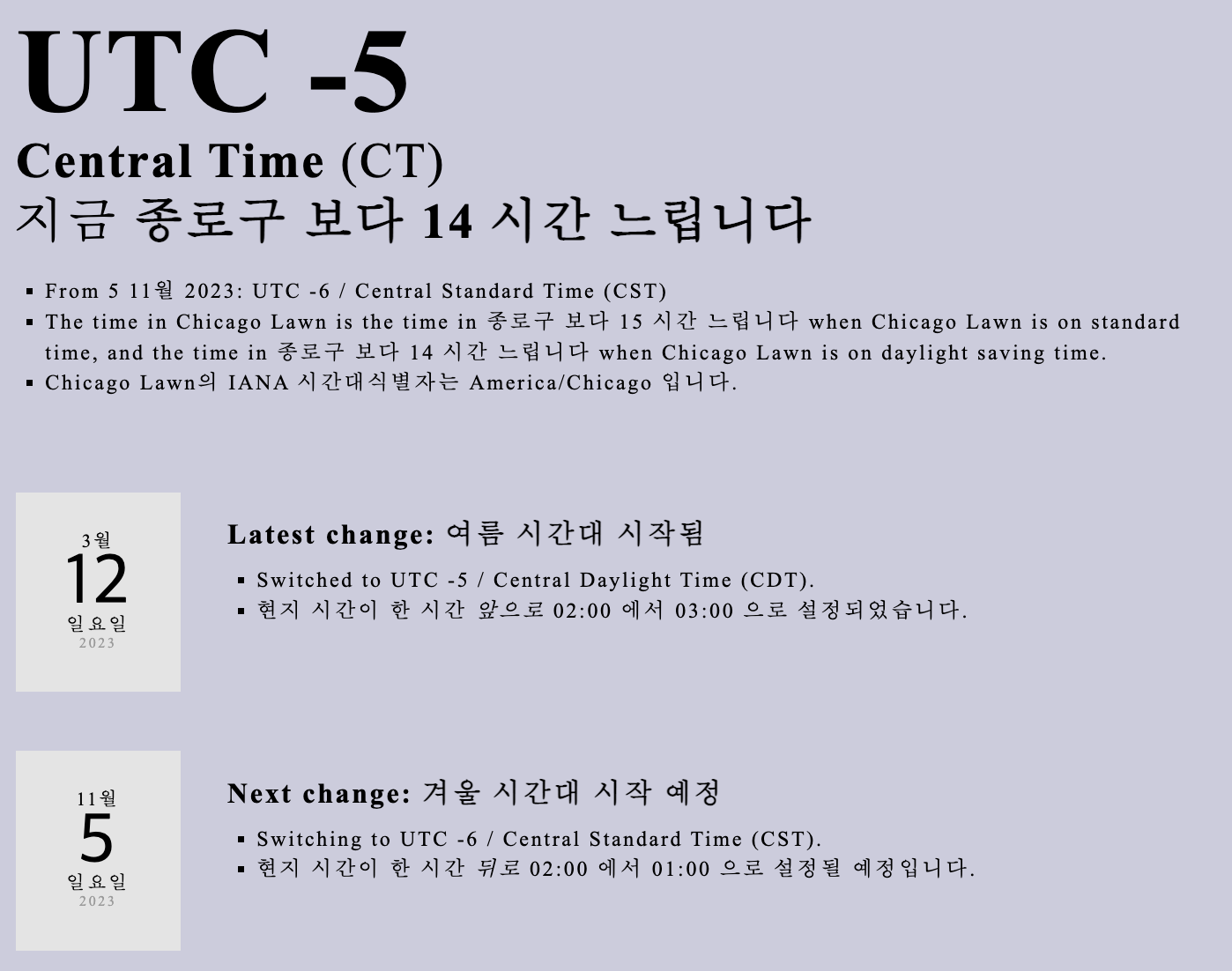 현재 글을 작성할땐 Chicago는 summer time 기간이다. 그래서 isDaylightSavingTime이 true이고, summer time 적용된 -5h이다.