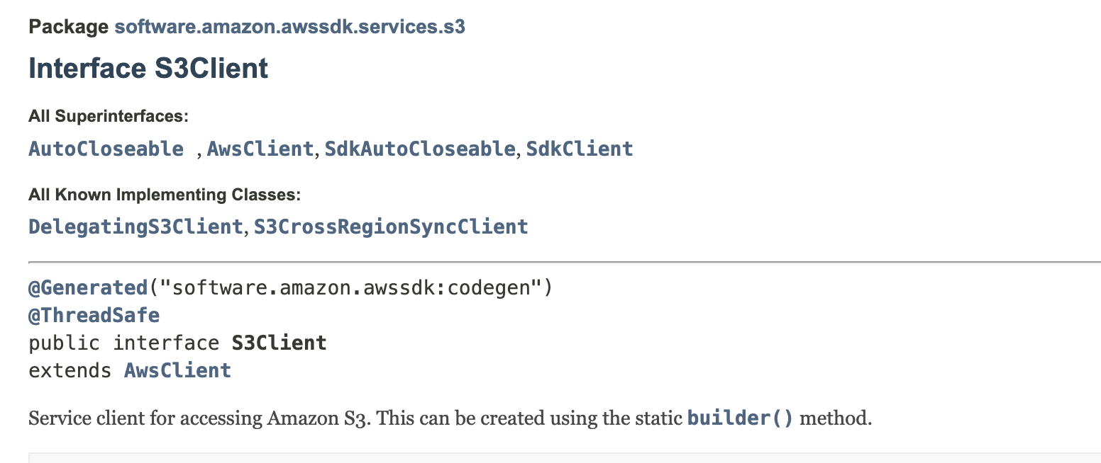 https://sdk.amazonaws.com/java/api/latest/software/amazon/awssdk/services/s3/S3Client.html