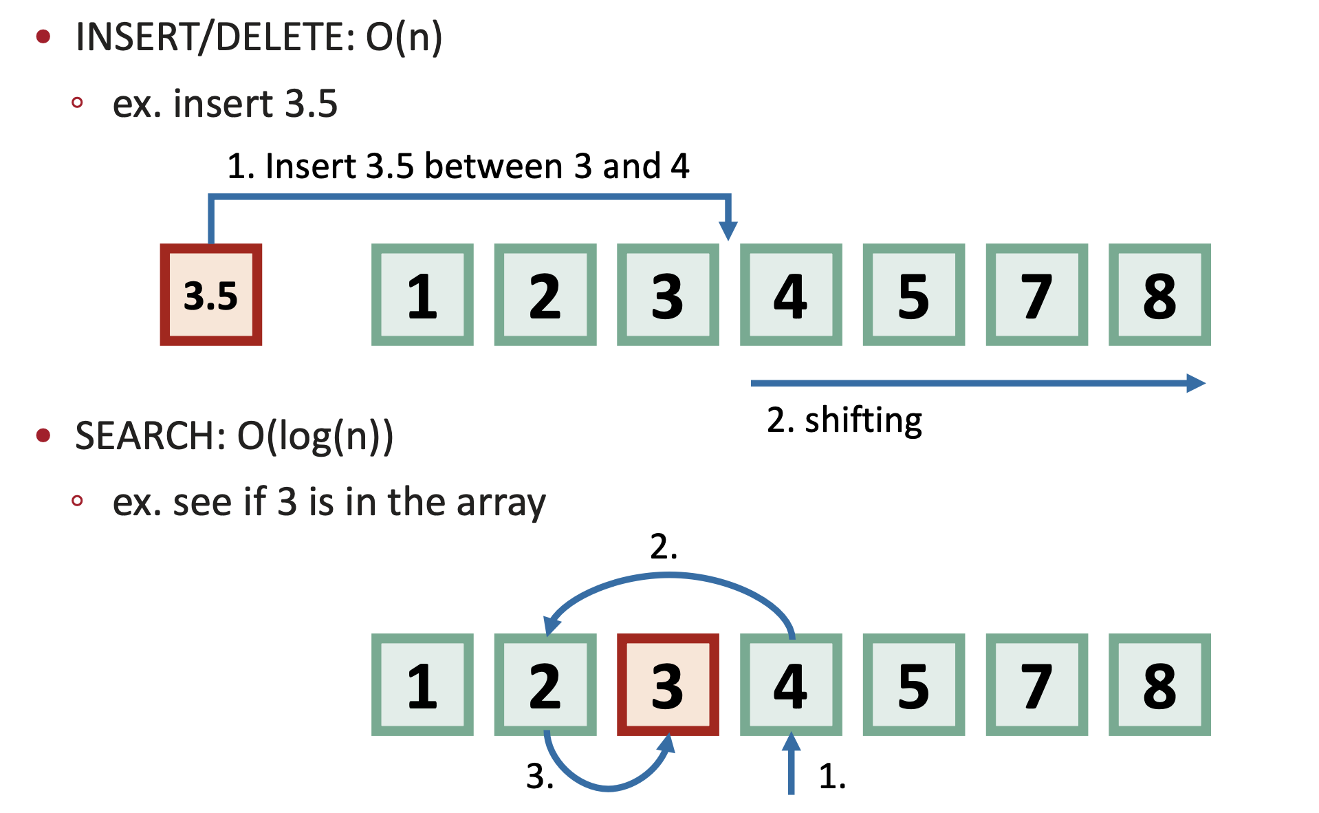 정렬된 배열에서의 연산과 시간복잡도는 다음과 같다.