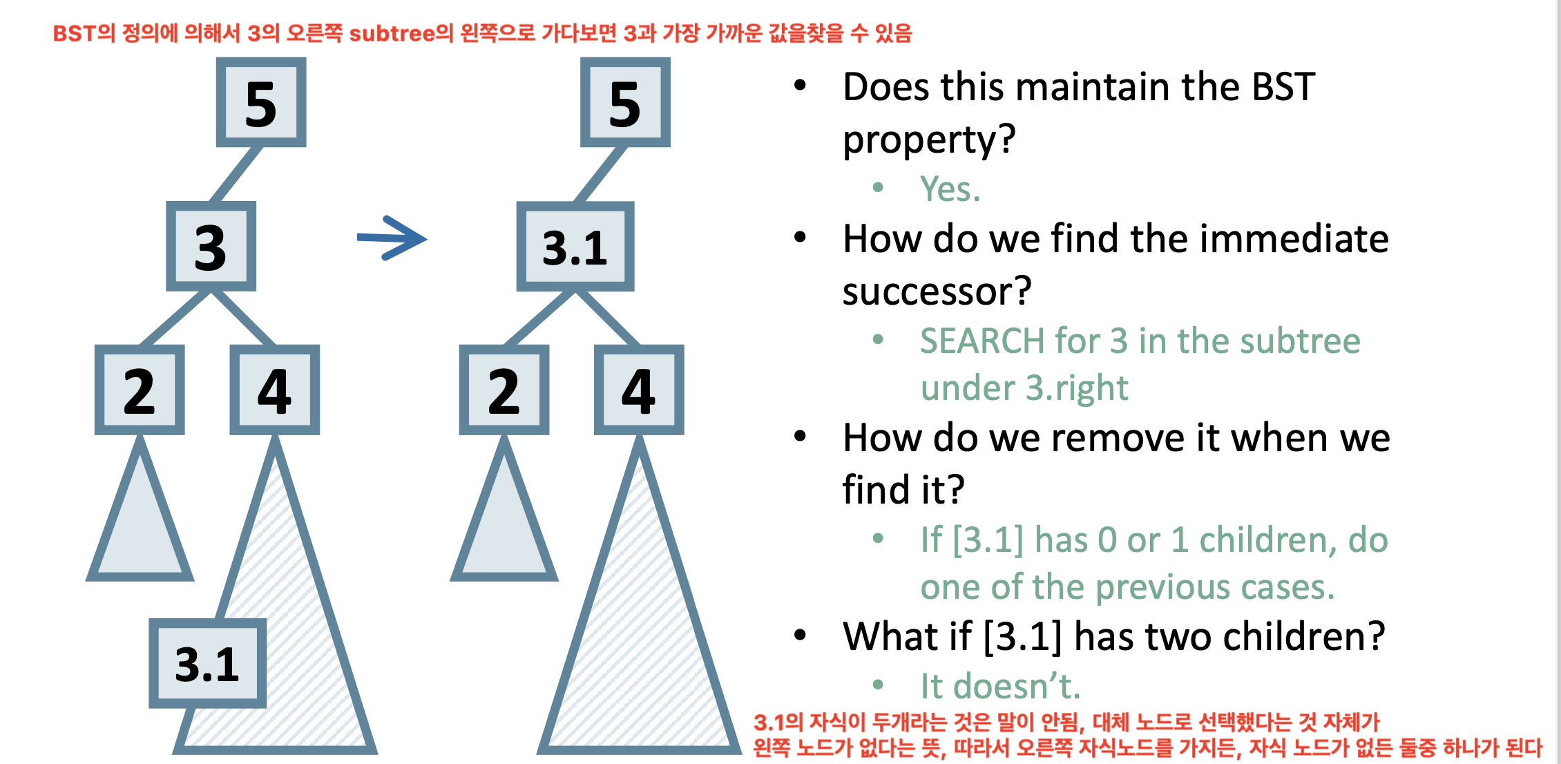 BST에서 삭제 또한 탐색이 필요하므로 삽입도 결국 트리의 높이만큼 걸린다