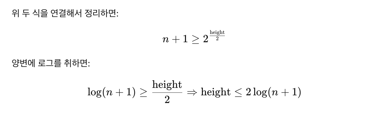그러면 전체 경로의 최대 길이는 2 × bh (검정, 빨강 번갈아 최대한 붙였을 때).