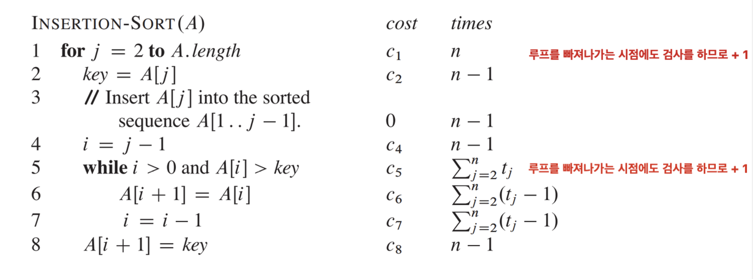 위 사진은 삽입정렬 의사코드를 분석한 사진이다
