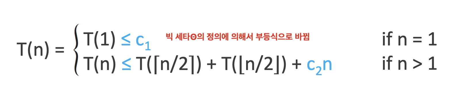 그래서 실제 계산할 땐 상한선만 보는 부등식 형태로 바꿔서 점화식을 다룹니다.