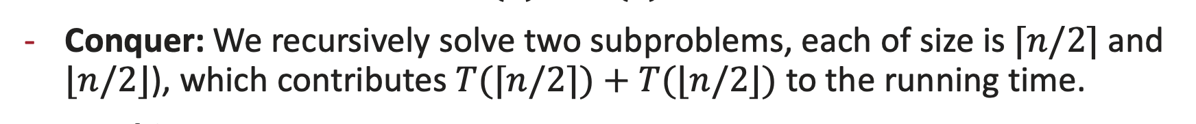 이 두 문제를 푸는 데 드는 전체 시간은 T(⌈n/2⌉) + T(⌊n/2⌋) 만큼 기여한다.