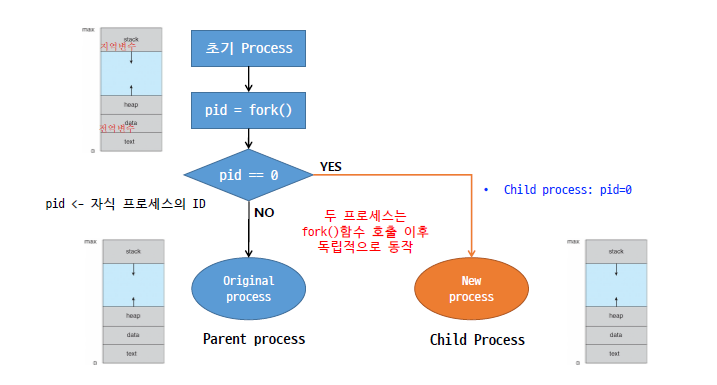 시스템의 흐름에서 실행 중인 프로세스를 복제하여 독립적인 두 작업이 서로 다른 경로를 갈라져 수행된다는 점이 중요하다는 것!