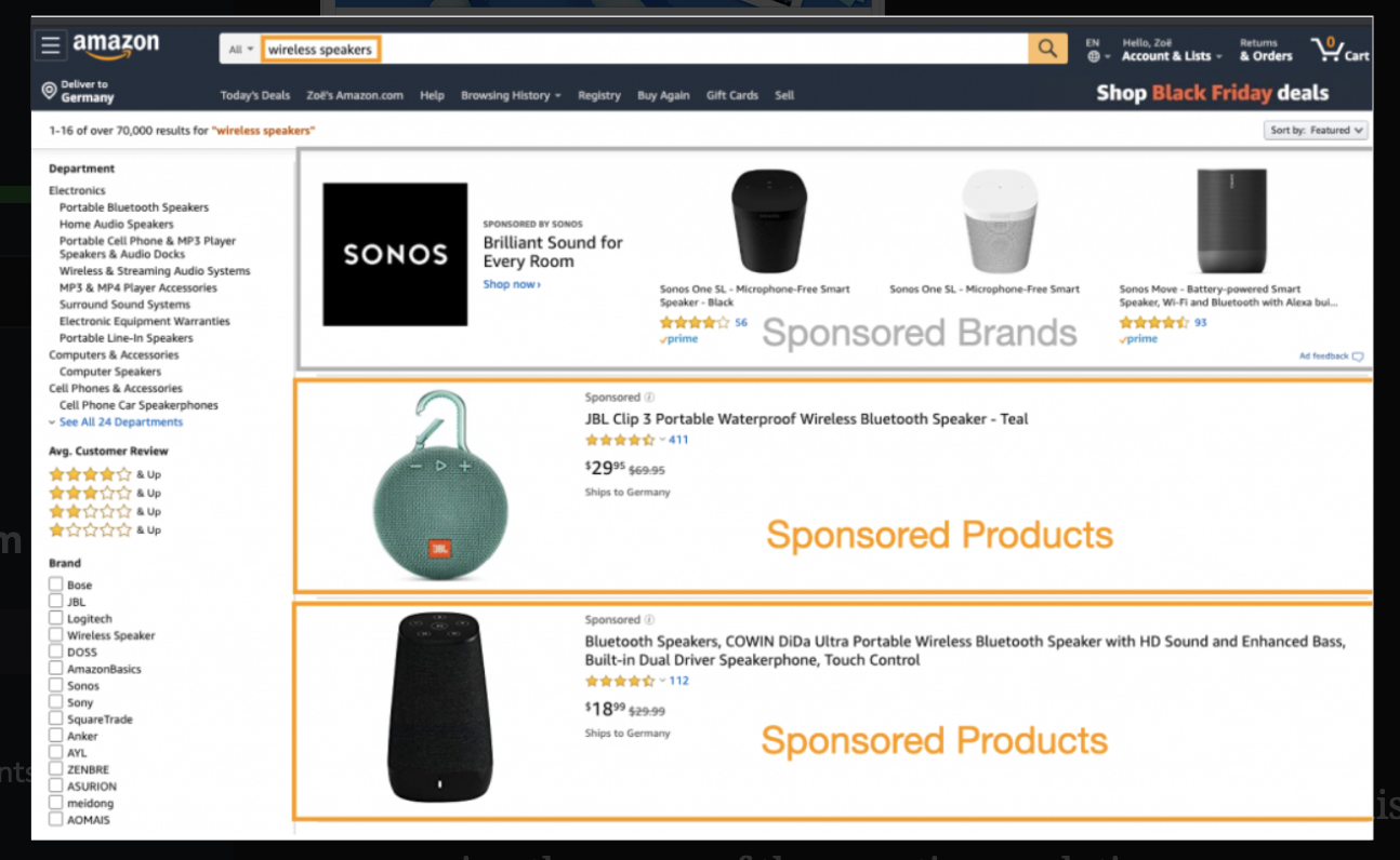 Amazon.com은 또한 일반적으로 아래 그림과 같이 쿼리 컨텍스트를 기반으로 검색 결과 페이지에 광고를 표시한다.