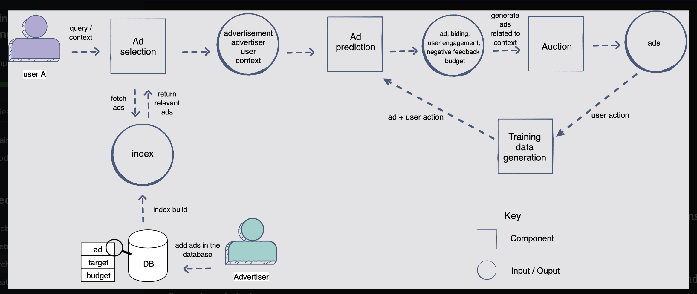 광고 선택 구성요소는 타겟팅 기준(사용자 인구통계 및 쿼리)과 일치하는 모든 광고를 선택하고 간단한 모델을 사용하여 광고의 관련성 점수를 예측할 것이다.