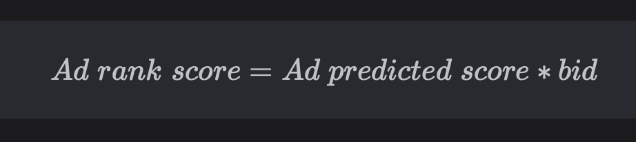 순위 순서는 예측 광고 점수(광고 예측 구성요소의 점수)에 입찰가를 곱한 값을 기준으로 계산된다.
